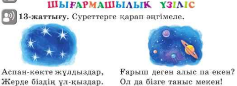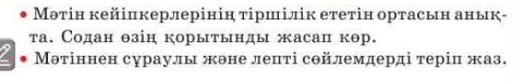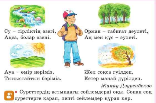 2.3.7.1 сөйлем түрлерінің айтылу мақсатына сәйкес тыныс белгілерін (нүкте, үтір, сұрақ белгісі, леп белгісі) қолдану 2.2.1.1 сұрақ қою арқылы (не істеді? қандай? неліктен?) мәтін түрлерін (әңгімелеу, сипаттау, пайымдау) және құрылымдық бөліктерін (басы, негізгі бөлім, соңы) анықтау; |