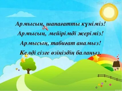 ЕҚБ Өлең жолдарын тиісті дауыс ырғағымен оқы. Бұлардың қандай сөйлем екенін айт Армысың,шапағатты күніміз! Армысың,мейірімді жеріміз! Армысың,табиғат анамыз! Келді сізге өзіңіздің балаңыз!