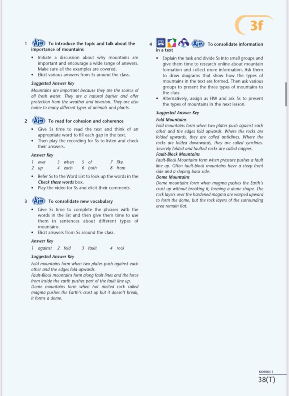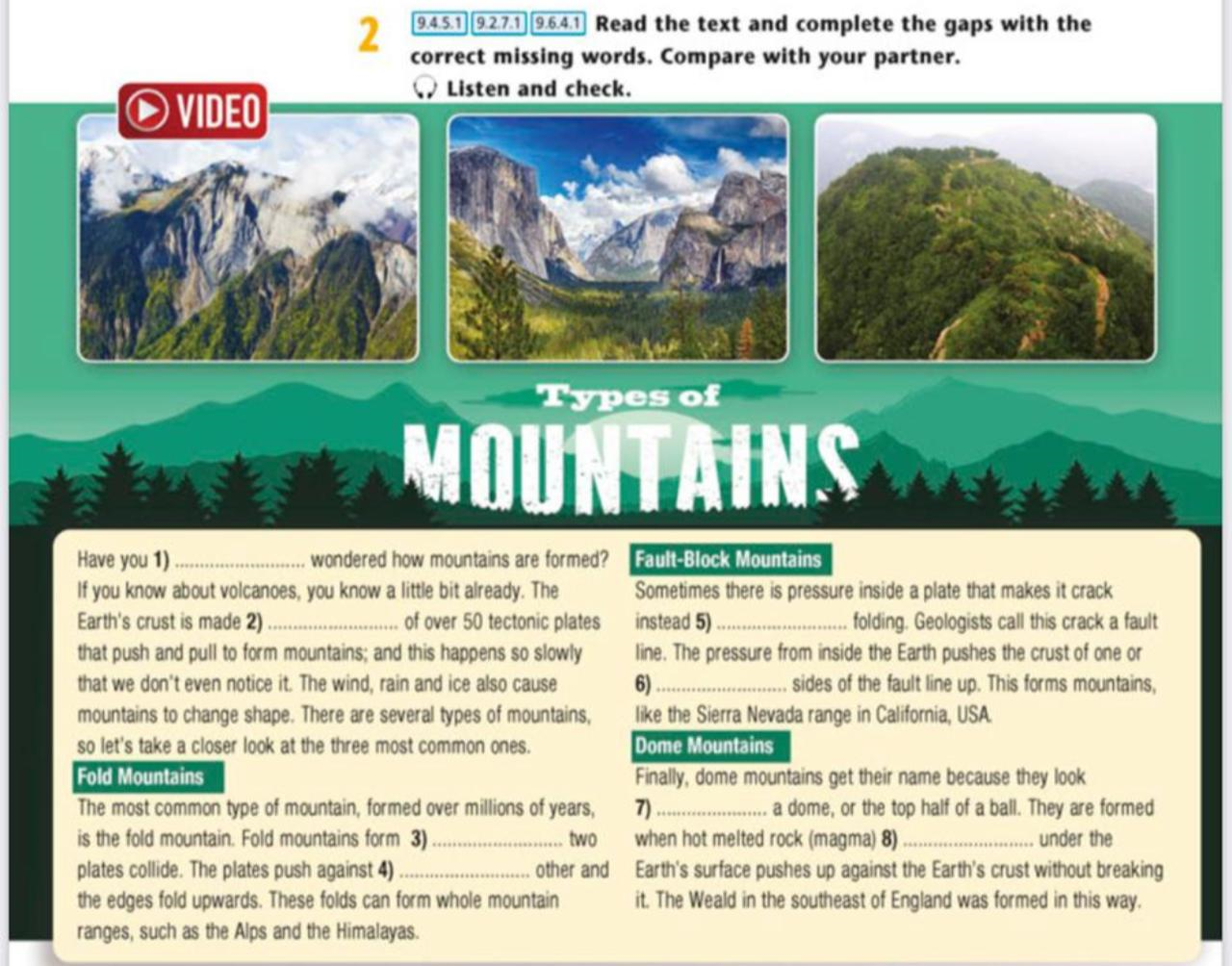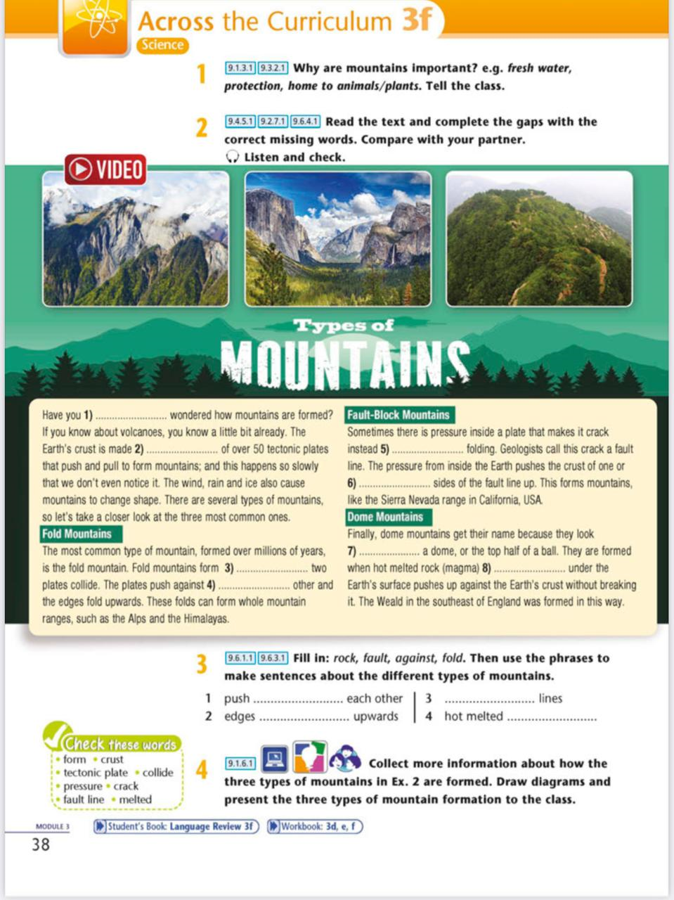 To consolidate information in a text • Explain the task and divide Ss into small groups and give them time to research online about mountain formation and collect more information. Ask them to draw diagrams that show how the types of mountains in the text are formed. Then ask various groups to present the three types of mountains to the class. Alternatively, assign as HW and ask Ss to present the types of mountains in the next lesson. |