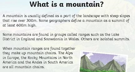 Descriptor: --fill in words correctly - make sentences about different types of mountains using these T praise active Ss with phrases such as: “Good job! Well done!” “One more time, please” |