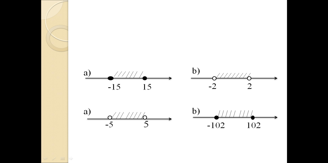 Индивидуальная работа. Для закрепления и оценки усвоения пройденного материала предложить учащимся задания из учебного пособия уровня В, аналогичные заданиям, решенным при групповой работе или предложит задания Приложения 3. Каждый выполняет самостоятельно. Приложение 2 Задание 1. Изобразите на числовой прямой множество решений неравенства: 1) Задание 2. Запишите неравенство с модулем в виде двойного неравенства: 1) Задание 3. Двойное неравенство запишите в виде одного неравенства с модулем: 1) Задание 4. Множество чисел x, изображенное на рисунке, записать в виде двойного неравенства и неравенства, содержащего знак модуля.