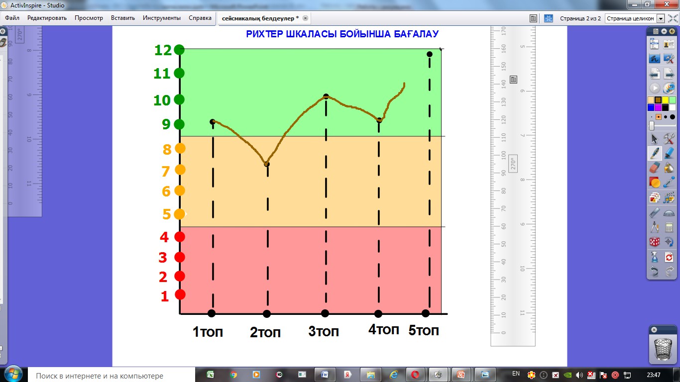 Бағалау: Әр топ бір- бірінің жұмысын тақырыпқа сай «Рихтер шкаласы» бойынша бағалайды. Нәтижесінде қай топ бүгінгі сабақты қаншалықты сілкіндіргені белгілі болады