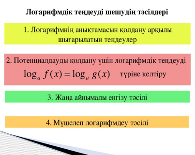 - логарифмдік теңдеулерді шешу әдістерін біледі және қолданады; |