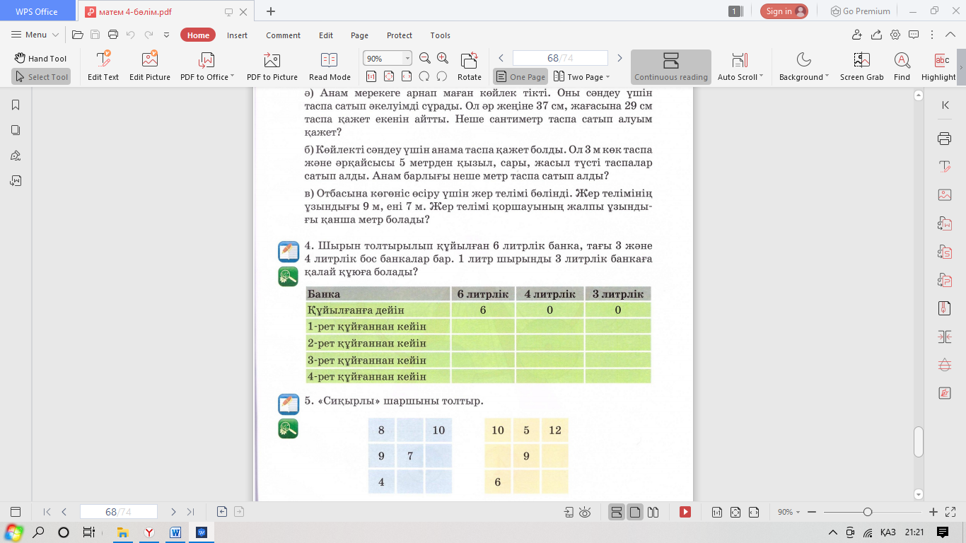 Сергіту сәті «Қаражорға» әуенімен жаттығу жасайды. (Д) 2- тапсырма «Есептеп көр» әдісі арқылы жүзеге асады. А) Сыйымдылығы 5л және 7 л екі ыдыстың көмегімен өзеннен 6 л суды қалай құйып алуға болады? Ж: 7 л шелекпен су алып 5л шелекке құяды. Қалған 2л суды бос ыдысқа құйып алады. Осылай 3 рет қайталап, 6 л су құйып алуға болады. Ә) Есептерді шығар.
