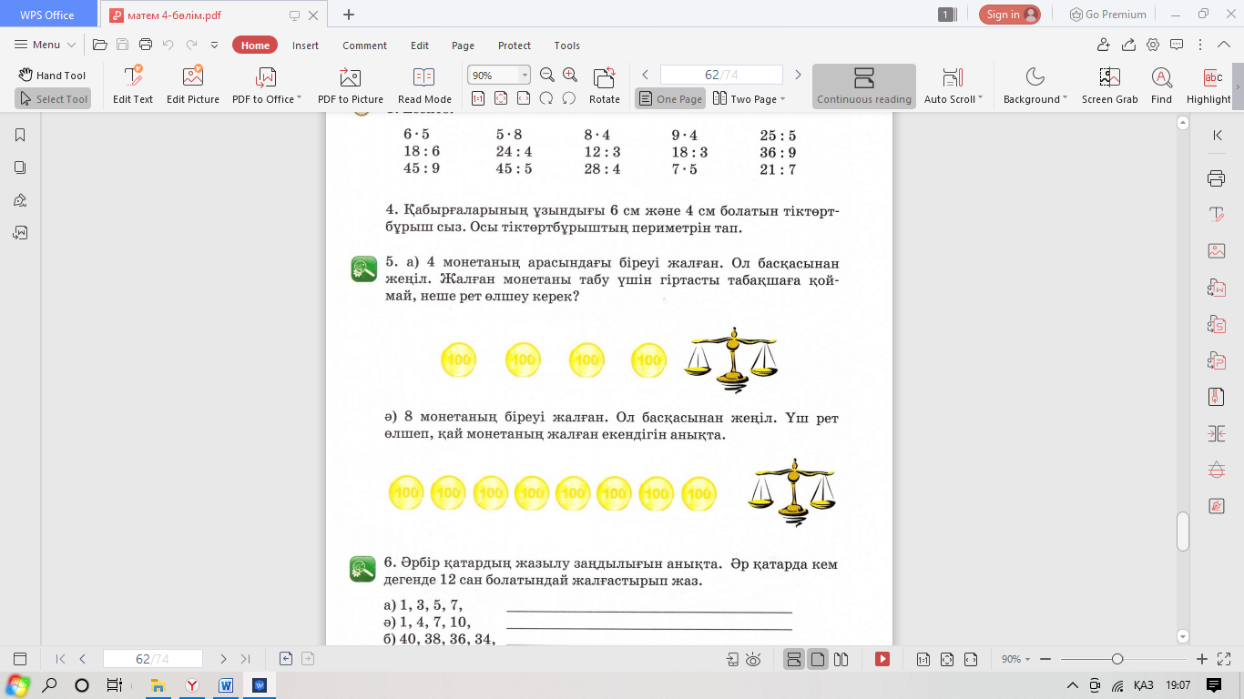 - Есептерге сәйкес келетін өрнектерді табады. - Сурет бойынша есептер құрастырып шығарады. Билеп сергиді. - Өрнектердің мәнін уақытқа есептейді. - Әр қатардың жазылу заңдылығын анықтайды. - Әр қатарда кем дегенде 12 сан болатындай жалғап жазады. |