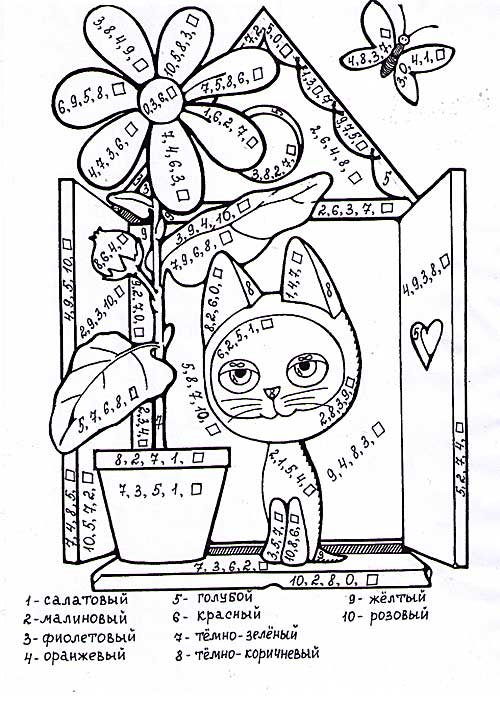 2+2=4 №5. Боя. 1-ашық жасыл, 2-малина түстес, 3-қара көк, 4-сәбіз сары, 5-көк, 6-қызыл, 7-жасыл, 8-қоңыр, 9-сары, 10-қызғылт түспен боя.