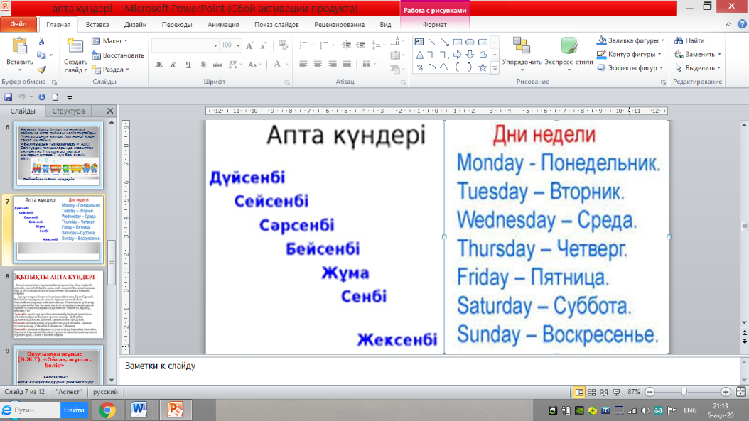 А Оқушылар бірге әнмен апта күндерін айтып үйренеді, қимыл жасайды. |