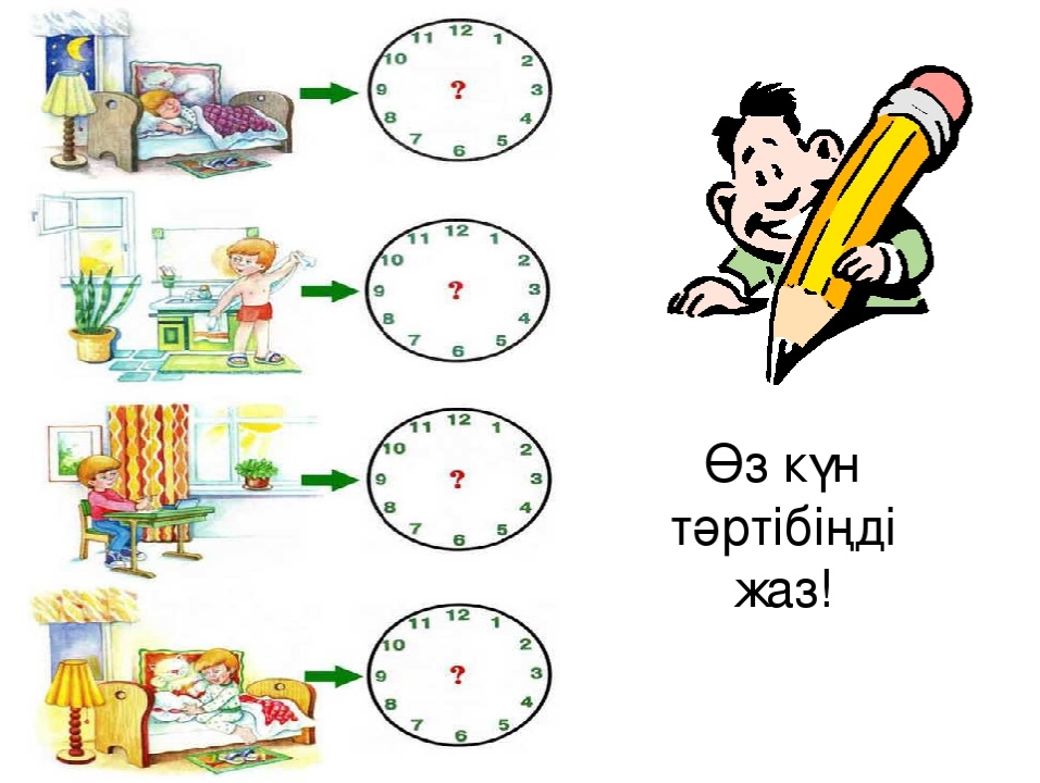 - - Дүйсенбі мен сәрсенбінің ортасында аптаның қай күні? - Сейсенбіге дейін аптаның қай күні? - Сәрсенбіден кейін аптаның қай күні? Суретке назар аударып уақыт ұғымын білдіретін кеше, бүгін, ертең атауларымен танысайық