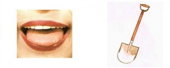 «Күрек» жаттығуы Орындалуы: езу тартып күліп, тілдің жалпақ ұшын төменгі ерінге салып қою.