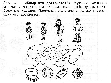 V. «Кім не алды?» ойыны. Сызықтармен жүру арқылы дүкеннен кім не алғанын тап.