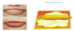 «Қамыр» жаттығуы Орындалуы: Ауыз сәл ашық, тілді бос қылып, алдыңғы ерінге салып, «пя-пя-пя» дыбыстарын айтып, тілді соғу. Тілді дірілдетпей бос қылып, осы қалыпта 1-5 секунд ұстау.