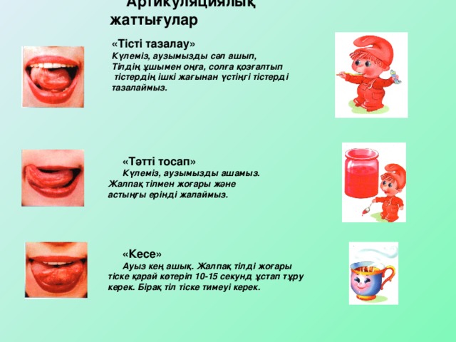 ІІ.Артикуляциялық массаж: - Енді, біз ояндық! Ұйқыдан тұрған соң не істейміз? - Дұрыс, жуынамыз. Керілеміз. Қане бәріміз айнаға қарап бетімізді жуамыз, маңдайымызды, көзімізді, қасымызды, тізімізді, құлақтарымызды 2-3 рет - Ал, енді тілімізді де ұйқысынан оятайық! «Таза тіс» арт- жаттығуы. Балалар, мына суреттен кімдерді көріп тұрсыңдар?