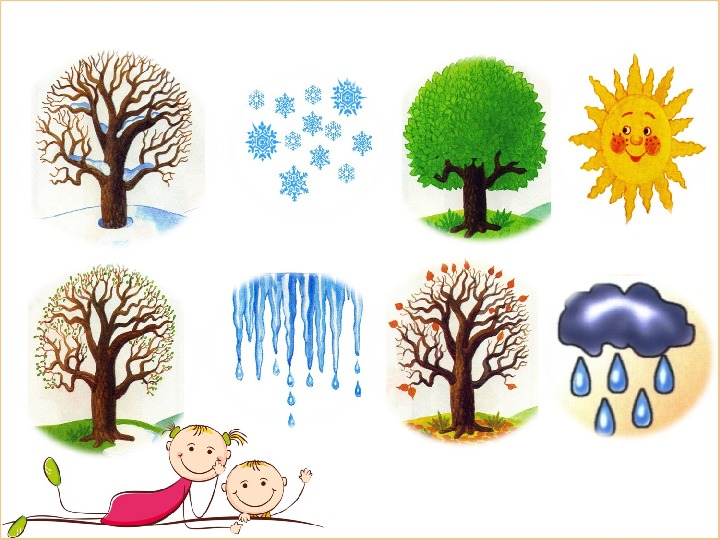 Әр топ жыл мезгілдерін қимылмен сипаттайды. Күз тобы: 1) жаңбыр жауып тұр; 2) жапырақтар түсе бастады; 3) жел соғып жатыр; 4) құстар жылы жаққа ұшып кетеді; 5) күн суыта бастады; Көктем тобы: 1) қар ериді; 2) жылғалардан ағады; 3) ағаштар бүршік жарады; 4) бәйшешектер өсіп шығады; 5) жыл құстары ұшып келеді. Қыс тобы: 1) қар жауып тұр; 2) аязды күндер басталды; 3) тайғақ; 4) ұйқы басатын кез; 5) ағаштарда жапырақтар жоқ; Жаз тобы: 1) ыстық; 2) айналада барлығы гүлденеді; 3) құстар сайрайды; 4) балалар суға шомылып жүр; 5) масалар шағады; ІІ. Сөйлеу тілін түсінуін дамыту. «Әли мен Айя» жыл мезгілдері тақырыбы аясында мультфильм көру. Сурет бойынша сұраққа жауап беру.