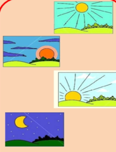 Мұғаліммен сәлемдеседі, сабаққа зейін қояды. Дыбыстарды тыңдап, ажыратып, суреттен белгілейді. Оқушы: Күн шықты, Күн батты. Ай шықты, Ай батты деп сөйлем құрайды |