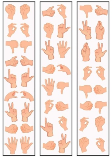 сәті: Жел соқты, Жел қатты соқты. Жаңбыр жауды, Жаңбыр қатты жауды. Жаңбыр тоқтады, Күн шықты, Таң атты! V. Саусақ жаттығуы «Қоян» Көрсеткіш саусақпен ортаңғы саусақ тік ұсталған. Басбармақ шынашақ пен шылдыршүмектің арасына қысылған. «Мүйізді ешкі» Көрсеткіш пен шынашақ саусақ тік ұсталған, басбармақ– ортаншы мен шынашаққа майыстырылған. «Маймақ аю» Төрт саусақ үстелдің үстіне қойылған. Ортаңғы майысқан – ол «аюдың басы». «Түлкі» Алақанды тік ұстап түлкінің бейнесін келтіру керек. Басбармақ сәл-сәл көтерілген – бұл құлағы. Көрсеткіш саусақ сәл майысқан – бұл маңдайы. Ортаңғы саусақ-мұрны. VІ. «Зейінін шоғырландыруға, көріп қабылдауын дамытуға арналған тапсырма». Жіптін соңын тауып, бояңдар