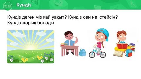 Мұғаліммен сәлемдеседі, сабаққа зейін қояды. Тәулік бөліктерін қайталап, еске түсіреді. Көліктің дыбыстарын қайталайды. Күндіз –күн шыққан кез. Мен күндіз ойнаймын, Мен күндіз сабаққа оқимын. Мен күндіз серуендеймін (балаға толық жауапты қайталатып отыру) Апта сөзін табады. Оқушы сурет бойынша сөз құрап, жазады |