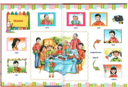Мұғаліммен сәлемдеседі, шеңберге тұрып, қимылмен мұғалім соңынан қайталайды Керіледі. Жуынады Күледі. Тілдерімен жоғары сосын төмен тістерінің үстінен жүргізеді 2-3рет Балалар өз ойларынан жауап береді. Отбасы мүшелерін атап шығады -Ата, әже, әке, ана, мен т.б Балалар суретке назар аударып, мұқият тыңдайды.