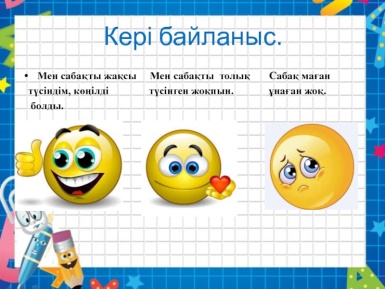 Қорытынды. Кері байланыс. Бүгінгі тақырыпта нені өттік? смайликпен бағалап жіберейік бүгінгі өткен сабақты.