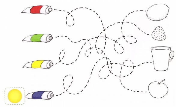 Сызықтарды қосып, сәйкес түске боя. Сөйлем құра: сын есім + зат есім Қызыл таңқурай Жасыл алма Сары лимон Көк саптыаяқ