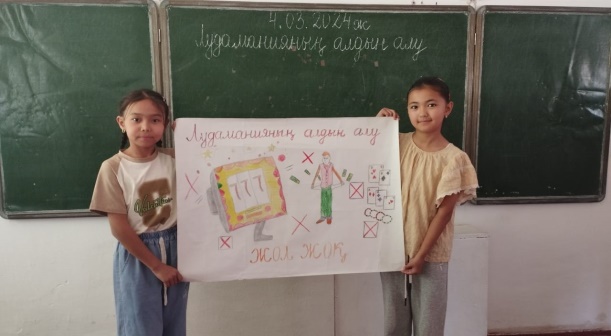 Шаттық шеңбері. - Балалар, шеңбер құрып, өлең жолдарын айтайық. Жақсылықтан үйреніп, Боламыз біз жақсы адам. Жамандықтан жиреніп, Үлгі аламыз жақсыдан. - Балалар, кәне, бір - бірімізге жақсы лебіздерімізді білдірейікші. - Бәріміз дос болайық. Тату болайық. т. б сөздер айтады. Сәлеметсізбе оқушылар бүгінгі «Лудоманияның алдын алу» атты тәрбие сағатымызды бастаймыз. Қазіргі өмір аясында жасы кәмелетке толмағандар компьютерлік ойындар мен автомат-ойындар ойнайтын орындарға жиі барады. Ғалым-зерттеуші А.Сидорованың 12-14 жастағы жасөспірімдерден тұратын 2 топқа компьютерлік ойынның әсерін білу үшін жүргізілген эксперимент нәтижесін талдау оған келесі шешімді жасауға мүмкіндік береді: Компьютерлік ойындардың жасөспірім психологиясына әсері барысында тітіркену, сезіктену, ойыншы тарапынан жағымсыз көріну секілді сезім артады. Компьютерлік ойынды ойнайтын жасөспірімдер балаларға тән кішігірім бұзақылықта немесе жеңіліске ұшырауда өздерін айыпты санайды. Компьютерлік ойынды ойнайтын жасөспірімдерде айнала қоршаған өмірге теріс қарау пайда болады (жақындармен ұрысу, айқайлау, басқаларды кемсіту) Мұндай жасөспірімдер тек үстем-үстем сөйлеп қана қоймай, денеге зақым келтіру әрекетін де қолданады. Мұндай әрекеттерді ойын барысында ұтқандар мен ұтылғандарды бақылай отырып аңғаруға болады. Жасөспірімдер айқайлайды, қасындағы заттарды лақтырады, сындырады, дүлейді айналасындағыларға шығарады. Зорлық-зомбылыққа негізделген компьютерлік ойындардың жасөспірімдер түйсігіне әсері проблемасын біржақты қарастыруға болмайды. Зорлық-зомбылық элементі бар компьютерлік ойындарды ойнау және өмірде күш көрсету – әртүрлі жайт. Бірақ зорлық-зомбылыққа ойын арқылы интерактивті қосылу оны әдетке айналдырады, аяныш білдіру, толғану, мүсіркеу және т.б. сезімдері ысырылады. Өмірде олар үшін адамды тапаншамен немесе автоматпен атып тастау, электроарамен кесіп жіберу, бомбамен бірнеше бөлікке бөліп тастау түк емес болып көрінеді. "Лудомания" терминінің түп мағынасына келсек, "лудо" - ойын, "мания" - ессіздік дегенді білдірді. Яғни, бұл - "ойынға есі кету" деген сөз. Дүниежүзілік денсаулық сақтау ұйымы лудоманияны құмар ойындарға әуес адамдардың дерті екенін дәлелдеді. Шынында да, қазіргі таңда ойынға құмарлық қоғамның дертіне айналып барады. Сонымен бұл дерт қалай пайда болды? Біздің елімізге қайдан келді? Жастар неге құмар ойындарға әуес болып барады? Міне, біз алдымен осы сауалдарға жауап іздемекпіз. Қазақта "Ойсыз ойынға құмар" деген сөз бар. Өткен тарихымызға үңілсек, қазақта құмар ойын ойнау деген ұғым болған емес. Бұл дерт біздің елімізге шет елдерден келді. Әлем елдеріндегі құмар ойындардың тарихына үңілсек, көне Үндістанда ерте заманда сүйек ойыны болған. Осы ойынның кесірінен кезінде бұл елдегі бір ханзаданың мал-мүлкінен, билігінен, тіпті, әйелінен айырылғандығы жөнінде жазылған деректер бар. Ал неміс халқында құмар ойыннан жеңіліс тапқан ойыншы өз азаттығынан айырылып, құл болып кетсе, Қытайда лудоманияның арқасында бүкіл бір армия қаржыландырылып отырған екен. Ең қызығы, құмар ойындар біздің елімізге сонау кеңес заманы тұсында келген. Кейбір деректерге сүйенсек, елімізде 1917 жылға дейін құмар ойындардың карталық түрлері дамыған. Олардың дені жеке клубтар мен орталықтарда ойнатылған.