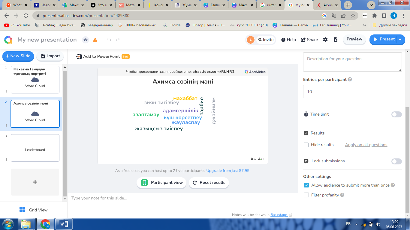 Тапсырма 3. Жеке жұмыс. Термин сөздермен жұмыс жасау. Ахимса, сатьяграха, сварадж, свадеши, гандизм (ЕБҚ: Басқа балалардың құрастырған анықтамасын оқып береді, сөздердің дайын мағынасын оқу арқылы есте сақтай алады) Дескриптор: - «Ахимса», «сатьяграха», «сварадж», «свадеши», «гандизм» ұғымдарының мағынасын ашады. |