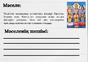 1-топ. Әлеуметтік мәселелерді шешу жолы 2-топ. Саяси мәселелерді шешу жолы 3-топ. Теңдік мәселесін шешу жолы 4-топ. Діни алауыздық мәселесін шешу жолы (ЕБҚ: М.Гандиге қатысты фотосуреттер көрсетіледі, соған қатысты өз ойын айтады) Дескриптор: - Үндістан қоғамында қалыптасқан мәселелерді анықтайды; - Мәселелерді шешудегі М.Гандидің әрекетін талдайды. |