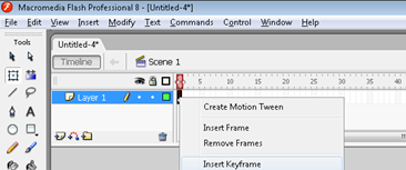 5-сурет. Insert Keyframe түймесінің орналасқан жері 8. Анимация орындалуы үшін шеңберді F6 клавишін басу арқылы жаңа орынға жылжытамыз. 9. Шеңбердің барлық жүру жолын белгілеп болған соң Control мәзірінің ішінен Test Movie командасын таңдап анимацияны көреміз. Егер анимация өзімізге ұнаса, File-Export-Export Movie командасу басу арқылы кез-келген компьютерде ашылатын .swf форматына экспорттаймыз. |