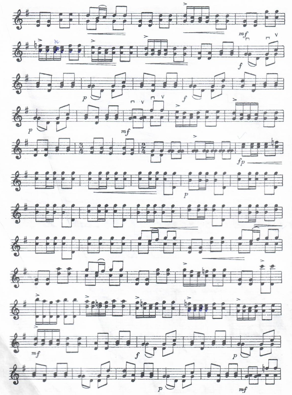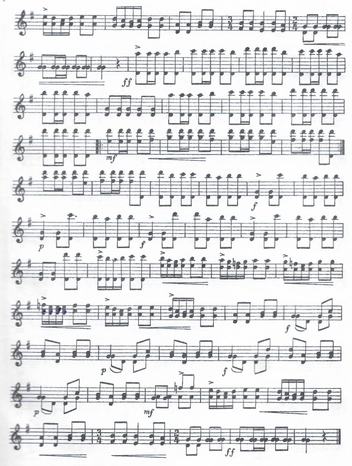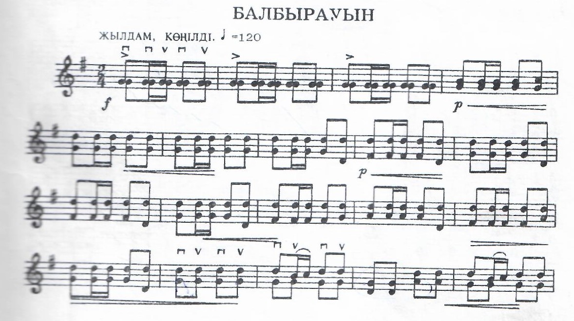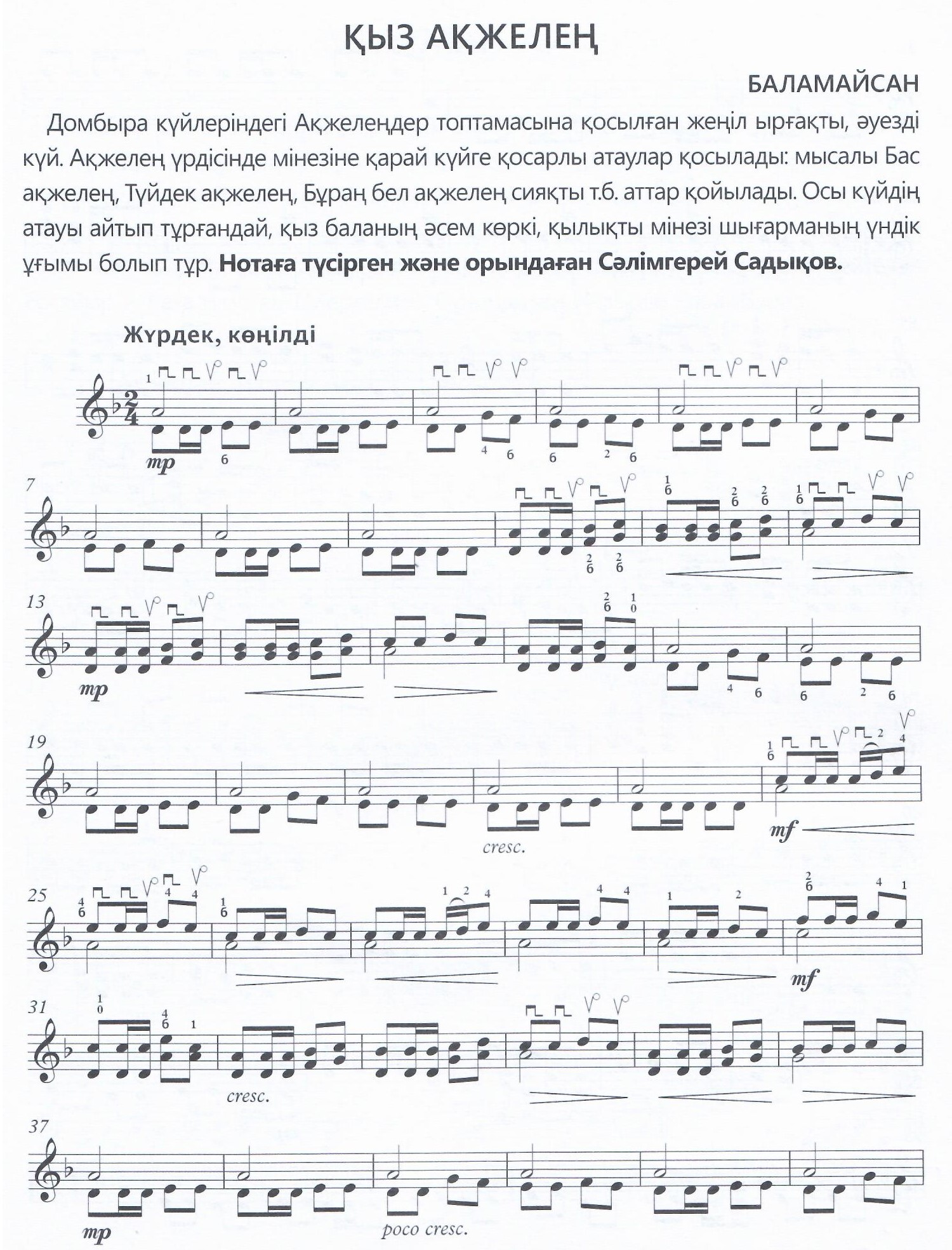 ІІ. Баламайсан – «Қыз Ақжелең» күйін үй тапсырмасын жай темпте нотамен ойнап көрсету. Оқушы үй тапсырмасын өз бетінен ойнап береді, қағыстар өзгеріп тұруына байланысты әзірге орта жай темпте орындаймыз.