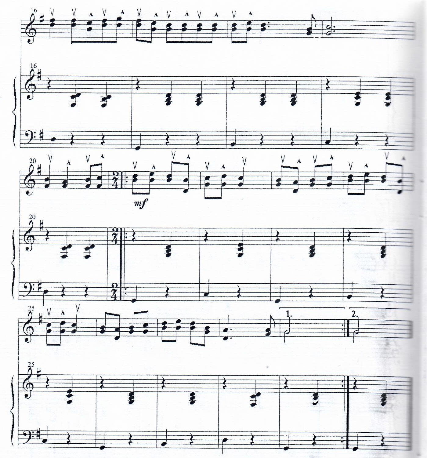 Әнді мұғалім өзі ойнап көрсетіп түсіндіреміз, кейін оқушыға 1 – сөйлемін санап ойнату. Қағыстарға көңіл бөліп ойнау. «Тремола» қағысына жеке тоқталып ойнап көрсету. Әнді толығымен тыңдату. Оқушының ойын, сезімін, түсінігін тыңдау.