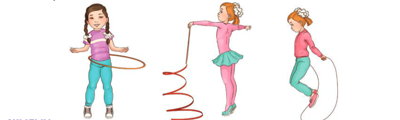 Дескриптор: Өлең шумақтарынан жаттығуға қатысты сөз тіркестерін теріп жазады. ОҚЫЛЫМ. АЙТЫЛЫМ. 9-тапсырма. Өлеңді оқы. Үлгі бойынша өлеңдегі жаттығу талаптарын өзсөзіңмен айт. Жаттығуларды кезек-кезекпен сыныпқа орындатыңдар. Үлгі: Бірінші жаттығуды орындаймыз. Қолымызды белімізге қоямыз. Сағат тілі секілді екі рет оңға, екі рет солға иілеміз! Тағы да қайталаймыз, Дескриптор: Өлеңді оқиды. Үлгі бойынша өлеңдегі жаттығу талаптарын өз сөзіңмен айтады. Жаттығуларды кезек-кезекпен сыныпқа орындайды. Айтылым. 10-тапсырма. Суретке қара.Балаларға ат қой.Олардың не істеп жатқанын айт.Сипатта.