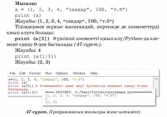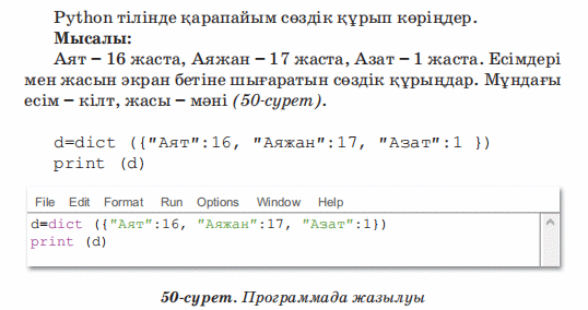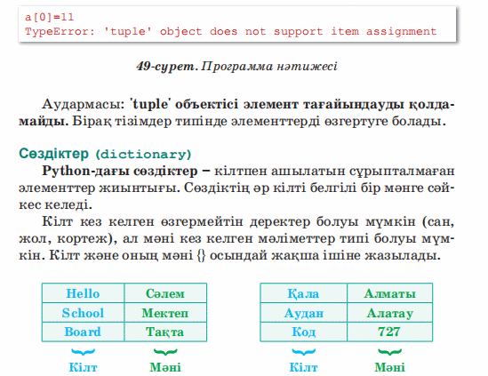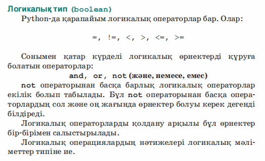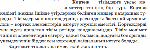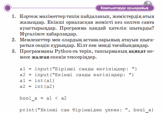 Дескриптор -логикалық типтерді бір-бірімен салыстырған кезде абай болу керектігін айтады 2 балл Дескриптор: Тізім мен кортежде қандай айырмашылық барын айтады 2 балл Дескриптор: -Кортеж мәліметтер типін пайдаланып, жемістердің атын жазады Мемлекеттер мен олардың астаналарының атауын шығаратын сөздік құрады 2 балл Дескриптор: Сұраққа жауап береді Дескриптор: Онлайн платформада сұрақтарға жауап береді 2 балл |