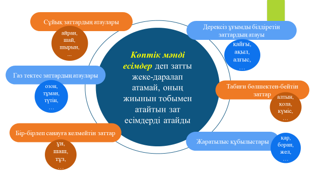 Грамматикалық тақырып «Көптік мәнді есімдер» Жаңа сөздермен таныстыру. Оқушыларды топқа бөлу. Топтық жұмыс «Стикерлер» әдісі. Әр топқа тапсырма: 1-топ: