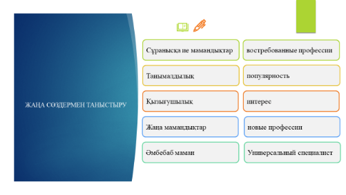 Жеке жұмыс «Менің болашақ мамандығым» тақырыбына өз ойларыңызбен бөлісіп, шағын мәтін жазыңыз (5-6 сөйлем) Сабақты бекіту WordWool қосымшасы арқылы Көптік мәнді зат есімдерді топтастырыңыз Сабақты қорытындылау Сөз әдебі мен сөйлеу этикеті формаларын орынды қолданып, ПОПС әдісі бойынша сабақты қорытындылаңыз - Балалар, бүгінгі сабақты қорытындылай келе сендерге айтайын дегенім – сендер болашақ мектеп бітіруші түлексіңдер, мамандықты таңдауда қателеспеңдер! Дұрыс мамандық таңдайсындар деп сендерге сенемін! -Бүгін сабақта не үйрендік? |