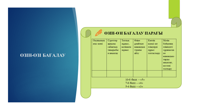 Дескриптор: - сурет бойынша әңгімелейді; - сабақтың тақырыбын анықтайды Қалыптастырушы бағалау: «Өзін өзі бағалау» парағы |