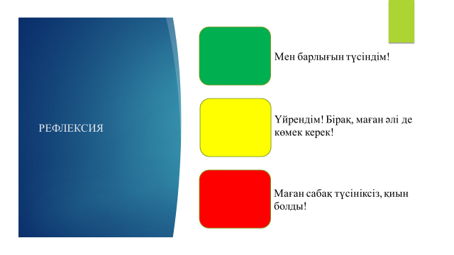 10мин. Түстерді таңдау арқылы екі топқа бөлінеді. Бір түсті таңдаған оқушылар бір топқа бірігеді. Әр топ өз тапсырмаларын А3 форматты қағазда орындайды, тақтаға шығып, жұмысын қорғайды. 13мин. WordWool қосымшасы арқылы тапсырманы орындайды. 7мин. Менің ойымша, ... Себебі ... Мысалы, ... Қорыта айтқанда, ... 3мин. Бағалау парақтарының критерийлері бойынша өзін-өзі бағалайды. 2мин. -жаңа сөздермен таныстық, тірек сөздерді анықтадық, мәтінмен жұмыс жасадық, диалог құрдық |