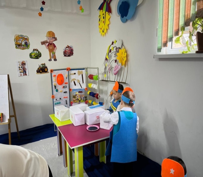 Балалар қалаған мамандықты таңдап үстел үстіненде тұрған материялдармен шығармашылық жұмыс жасады.