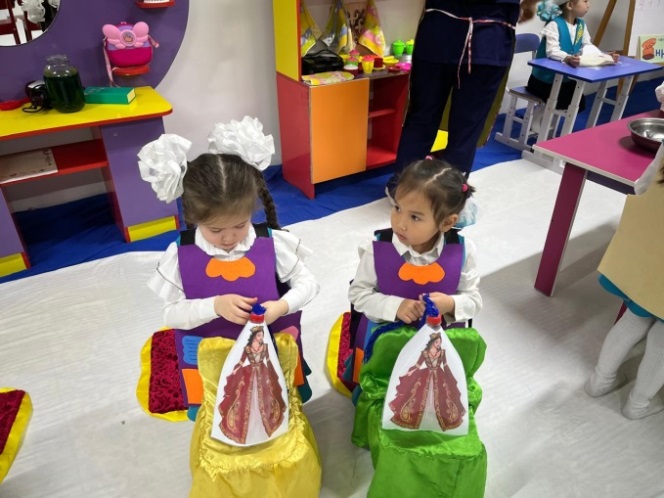 Үстел үстіне түрлі мамандық иелеріне қажетті құралдарды қойып, төрт баланы шығарамын, төрт баланы төрт түрлі мамандық иесіне бөлемін, ойын шартын түсіндіремін. Төрт бала өзіне қажетті құралдарды тез – тез бөліп алады. Алған құралдарымен не істеуге болтындығын айтады және өскенде сол маман иесі болғысы келетіндігін айтады. (шаштараз, дәрігер, мұғалім, аспаз)