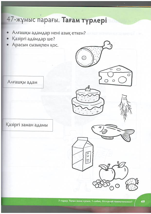 қажет? - Суреттен қандай тағам, сусын көріп тұрсыздар? - Суреттегі оқушылар қай мезгілде тамақтанып отыр? - Таңертең қандай тамақтар жеу керек деп ойлайсыңдар? -Зиянды тағам түрлері деп қандай тағамдарды айтуға болады? -Дұрыс тамақтану үшін неше мезгіл тамақ ішу қажет? ҚБ: Мұғалімнің кері байланысы «Шамшырақпен» бағалау. 4.Ұ.Оқулықпен жұмыс. Мұғалім мәтінмен жұмыс жасайды.«Ойлан-жұптас-бөліс» әдісі Саралау тәсілі: тапсырма I топ: Ежелгі адамдардың тамақтану ерекшелігін айтады. II топ : Қазіргі адамдардың тамақтану ерекшелігін айтады. III топ : Ежелгі және қазіргі адамдардың тамақтануын салыстыра отырып әңгімелейді. ҚБ:«Білезік» әдісі арқылы бағалайды. Сұраққа жалаң сөзбен жауап берсе-қызыл білезік Сұраққа толық жауап берсе-сары білезік Ойлануды қажет ететін сұраққа жауап берсе-жасыл білезік тағылады. 6. Саралау тәсілі: тапсырмалар Т: «Кім шапшаң?» семантикалық тапсырма беру. I топ. А: Тағам және сусын түрлерін табу.