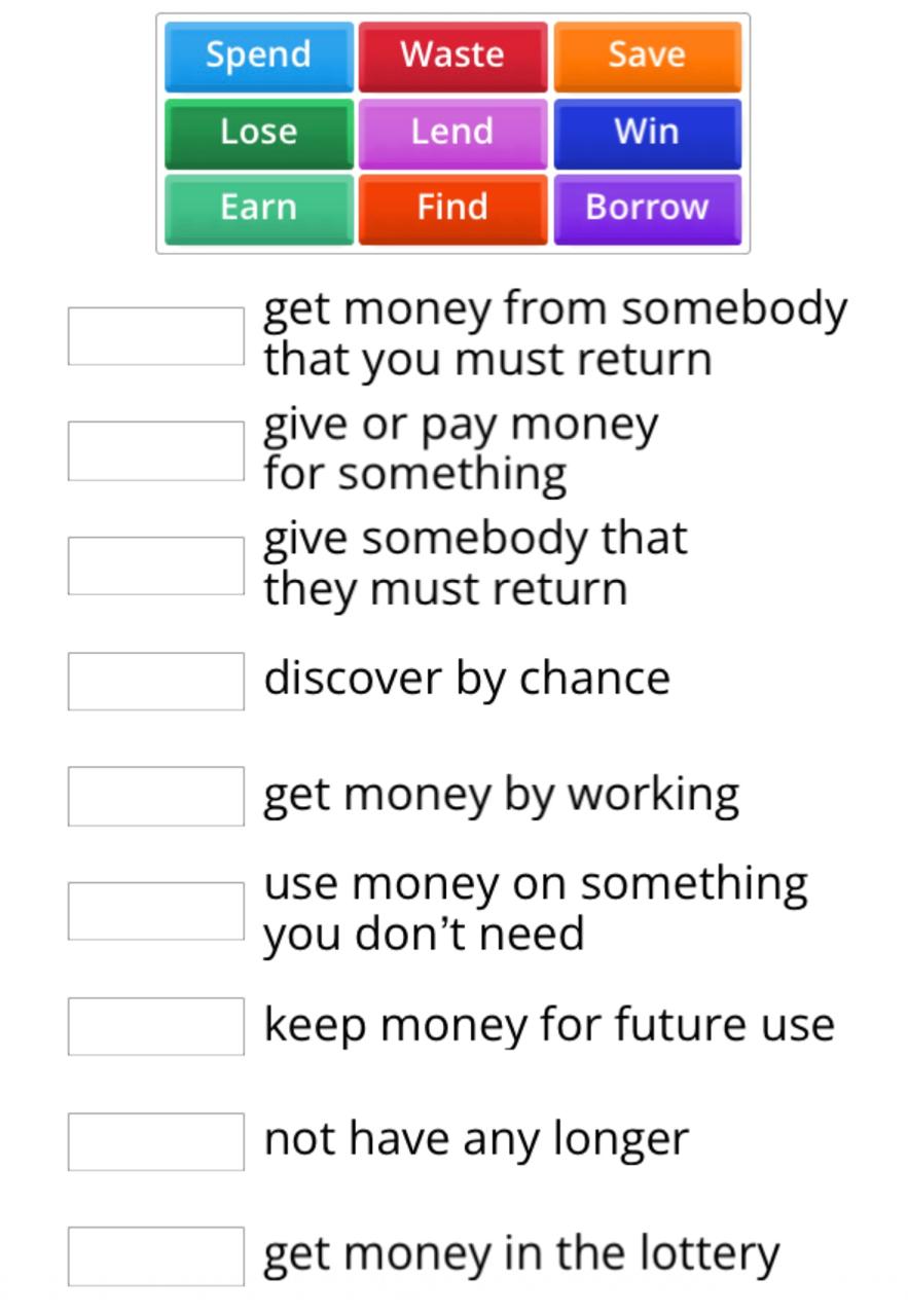 To pay-төлеу, bill-есеп айырысу, to spend-жұмсау, to borrow-қарыз алу, fine-айыппұл салу, to earn–табыс табу, to lend-қарыз беру, debts-қарыздар, grant-гранттар, to save- үнемдеу, to waste-ысырап ету, currency-валюта, cash-қолма-қол ақша, to economize- үнемдеу