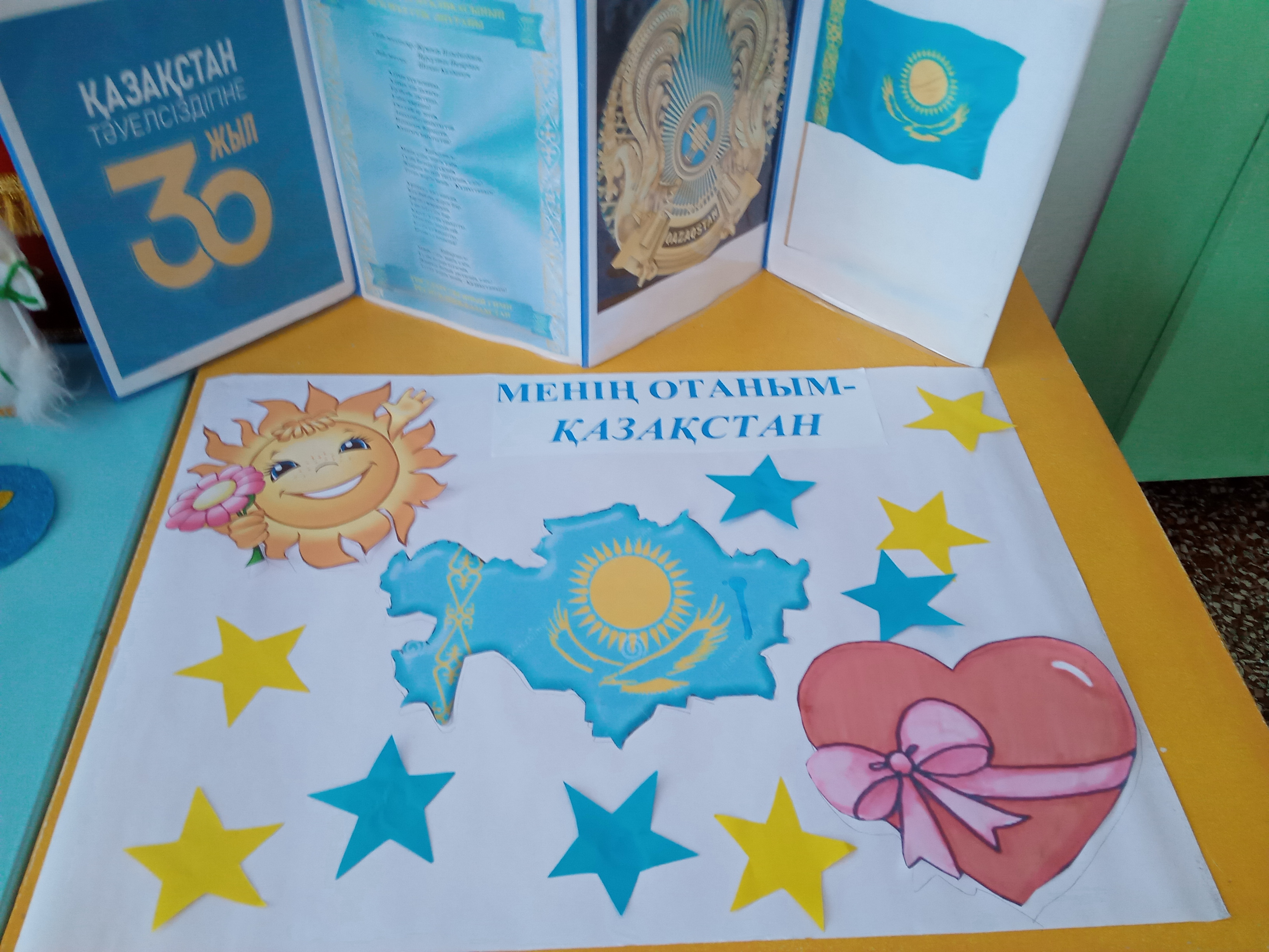 Биыл Тәуелсіздігімізге 30 жыл толып отыр. Бұл Тәуелсіздік – ащы термен келген тәтті жеңіс, төгілген қанның, өлмеген жігердің отымен келген ұлы күн. Осы мерейлі мереке қарсаңында Социалистік Еңбек Ері Есім Шайкин атындағы орта мектебімізде көптеген іс- шаралар өтіп жатыр. Еліміздің болашағы- бүгінгі ұрпақты еліміздің патриоты етіп тәрбиелеу- әрбір үлкен адамның міндеті. «Отан отбасынан басталады»- демекші, үйде ата- ана болса, мектепте мұғалімдер мен тәрбиешілер. Мен мектепалды даярлық сыныбында тәрбиеші болып жұмыс жасаймын. Алдымда отырған бүлдіршіндерге Тәуелсіздік жайлы түсіндіруге олардың тілімен сөз таба білу керек. Мереке қарсаңында тақырыптық сабақ өткіздім. Отанымыз Қазақстан екенін, өздерінің болашағы үшін Отанымыз барлық жағдайды жасап отырғанын айтамын. Ал олар білім алып, өсіп ер жеткенде осы Отанды көркейтуге үлестерін қосу керектігін саналарына құямын. «Елім менің- менің әлемім» атты сурет көрмесін ұйымдастырдық. Рәміздердің әр біреуіне тоқталып, әнұранды жаттадық. Рәміздерімізді қастерлеуді үйрендік. Мақал- мәтелдер үйреніп, «Елім деп соғады жүрегім,