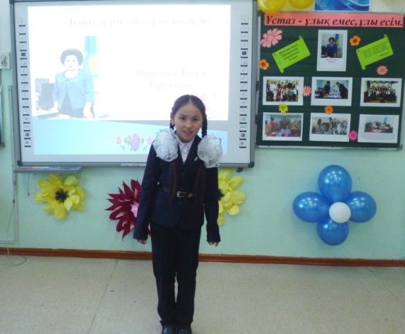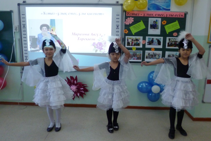 Бүкіл адамзат баласы бас иер асыл тұлға ұстаздардың ерен еңбегін, тарихтағы баға жетпес орнын паш ету мақсатында «Ұстаз - ұлық емес, ұлы қызмет» тақырыбында сынып сағаттары өтті. Сынып сағаттарында жас ұрпақты ұстазды құрметтеуге, ұстаз мамандығының қыры мен сыры түсіндірілді.