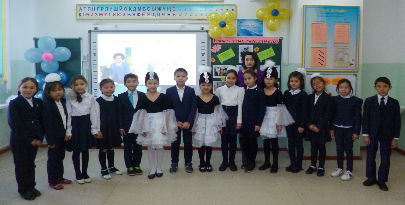 «Ұстаз аты – мәңгілік!» тақырыбында бастауыш сынып оқушылары арасында өлең шығару сайысы ұйымдастырылды. Бұл сайыстың мақсаты оқушылардың ұстаз мамандығын құрметтеуге, сыйлауға үйрету, ұстаз мамандығының қыры мен сырларын түсіне біліп, ұстаз еңбегін әрқашан бағалай білуге үйретуді көздейді. «Ұстаздық—ұлы құрмет, себебі ұрпақтарды ұстаз тәрбиелейді. Болашақтың басшысын да, данасын да,ғалымын да,еңбекқор егіншісін де ұстаз өсіреді» дей келе бастауыш сынып оқушыларының өздері шығарған өлеңдерін нақышына келтіре мәнерлеп оқыды. Шығарған өлеңдерінде «Ұстаз» мамандығына деген үлкен құрметті байқауға болады.
