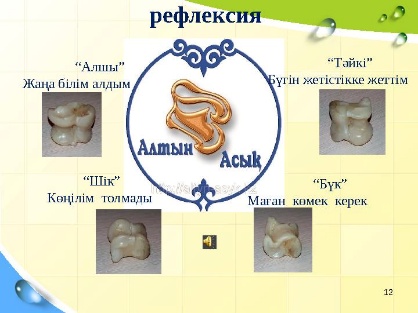 Рефлексия «Алшы, тәйке, бүк,шік» әдісі Сабақты қорытындылау мақсатында оқушылардың сабаққа деген көзқарасын, рефлексиясын білу үшін қолданамын