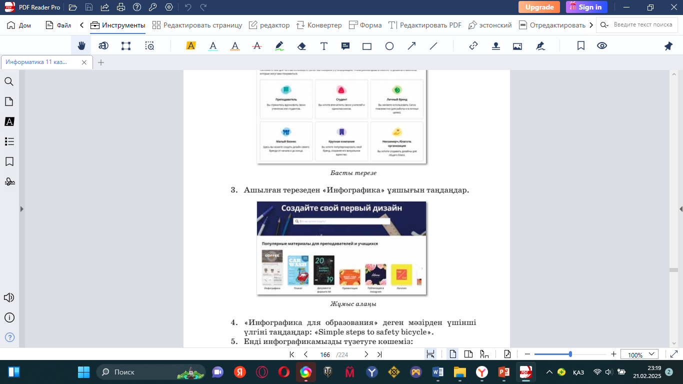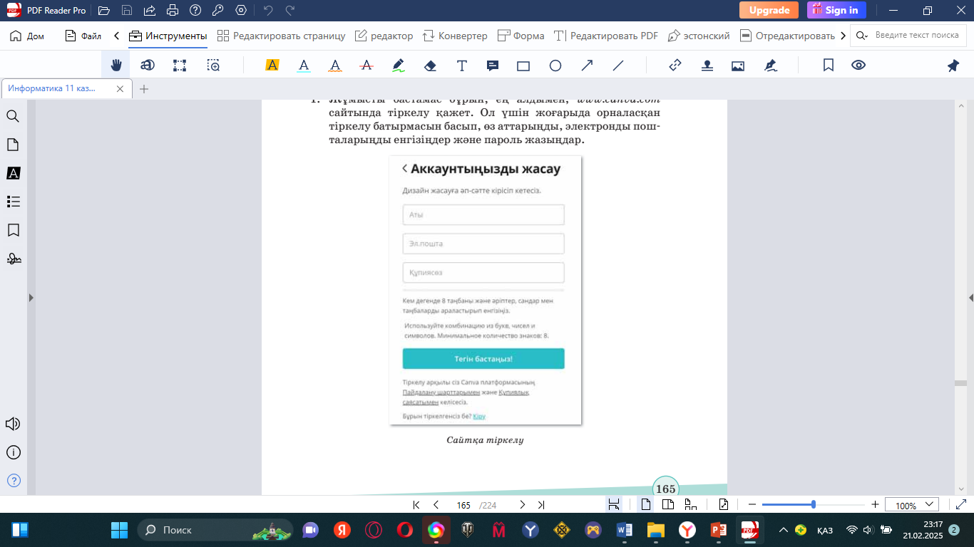 Өткен сабақта біз жарнаманың түрлері және жарнамалық инфографика жасауға арналған сервистерді, ең жиі қолданылатын логикалық операцияларды қарастырдық. Бүгін өткен сабақты бекіту мақсатында www.canva.com сервисімен жұмыс жасаймыз. Жұмысты орындау реті: 1. Жұмысты бастамас бұрын, ең алдымен, www.canva.com сайтында тіркелу қажет. Ол үшін жоғарыда орналасқан тіркелу батырмасын басып, өз аттарыңды, электронды почталарыңды енгізіңдер және пароль жазыңдар.