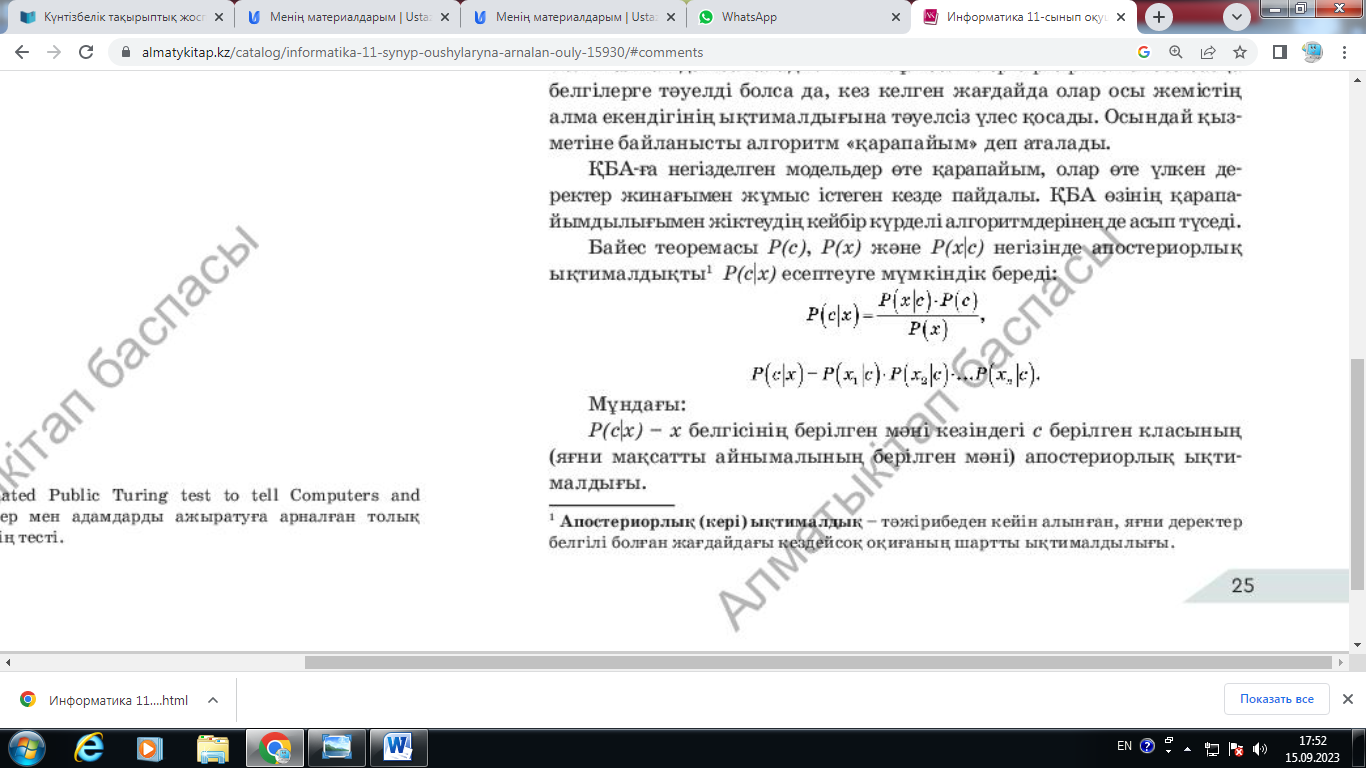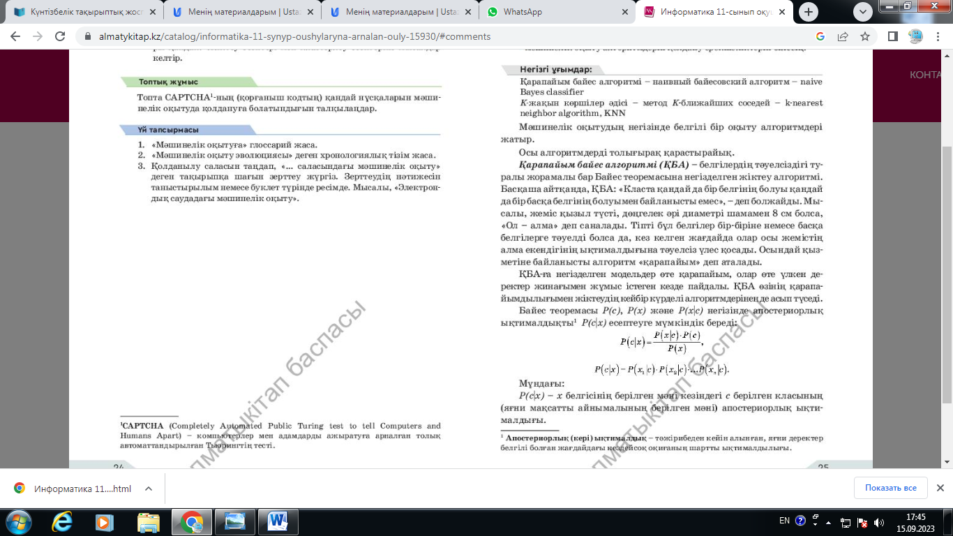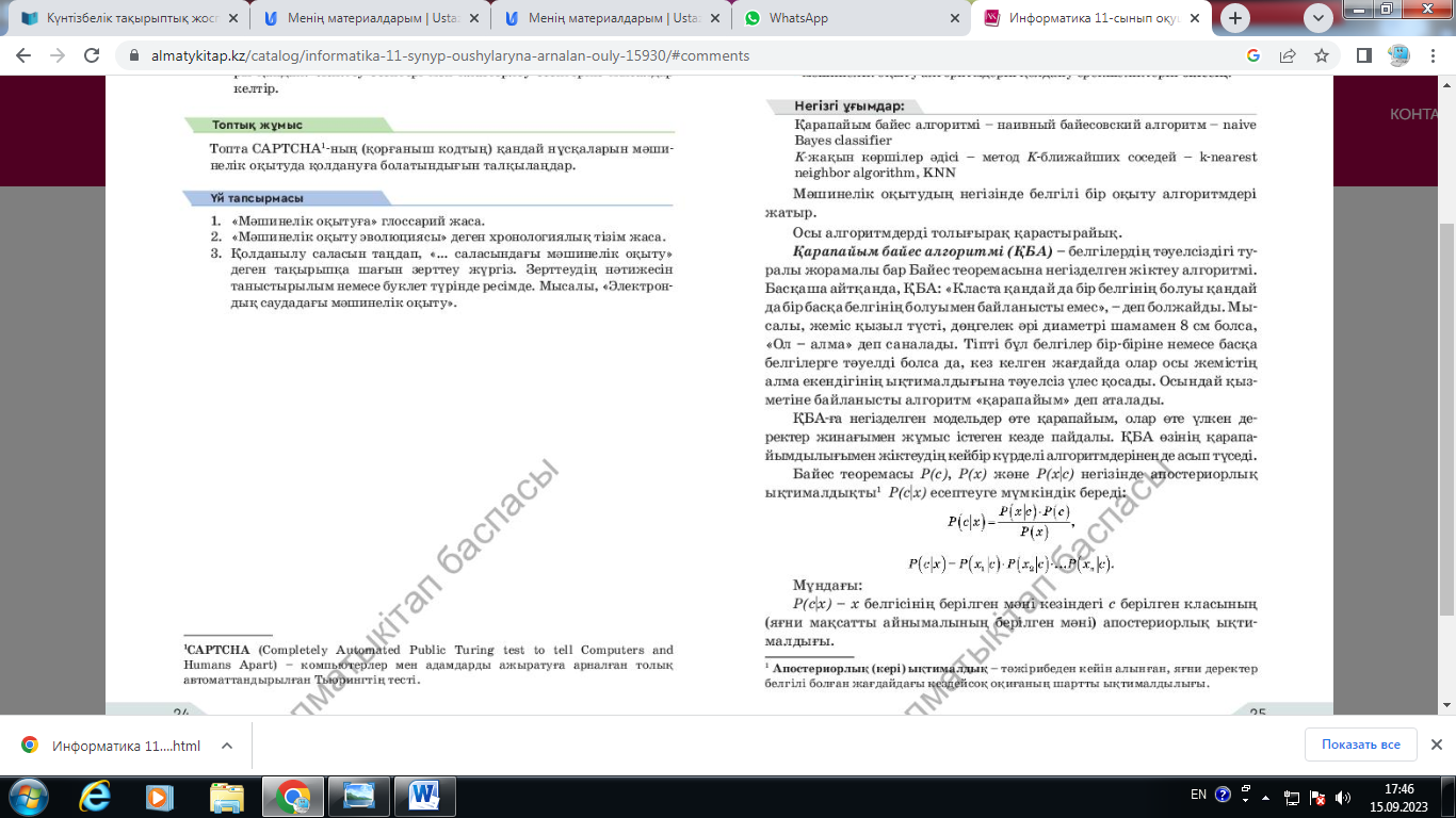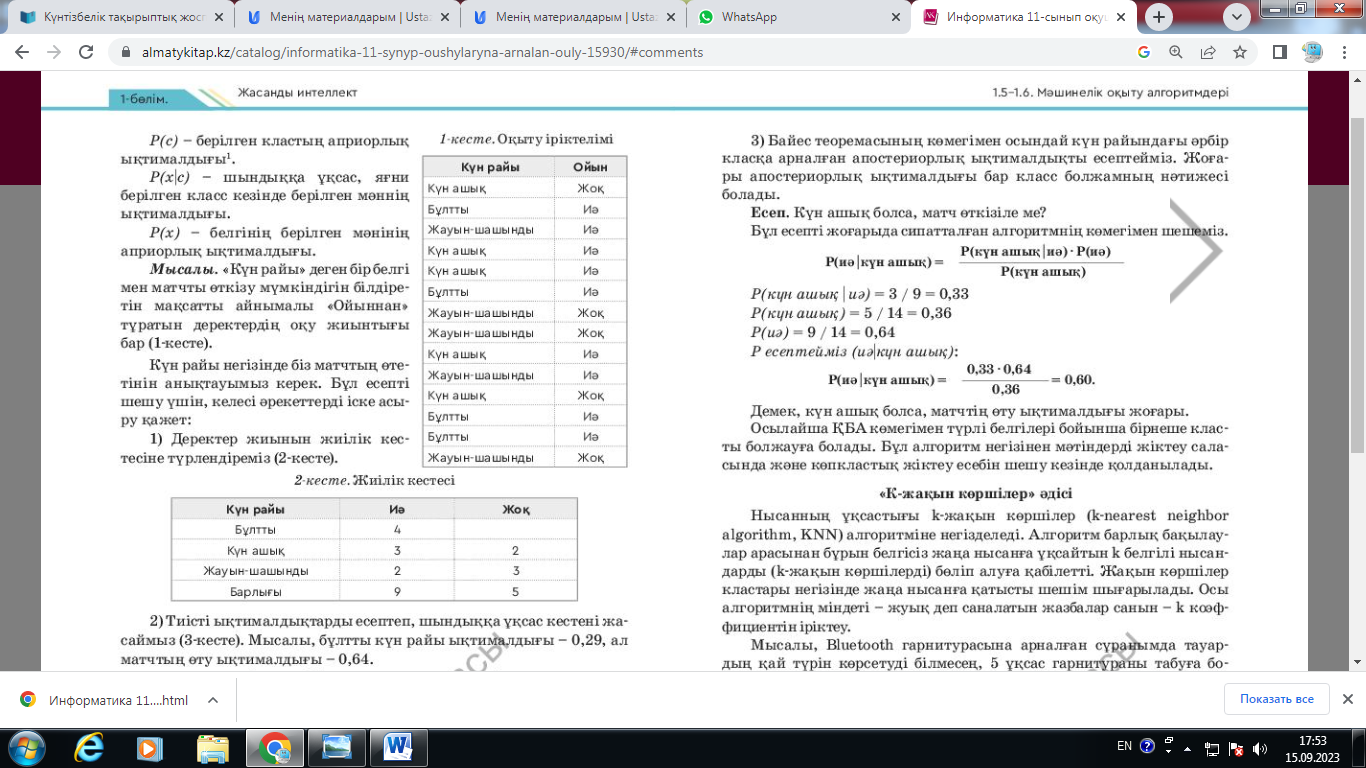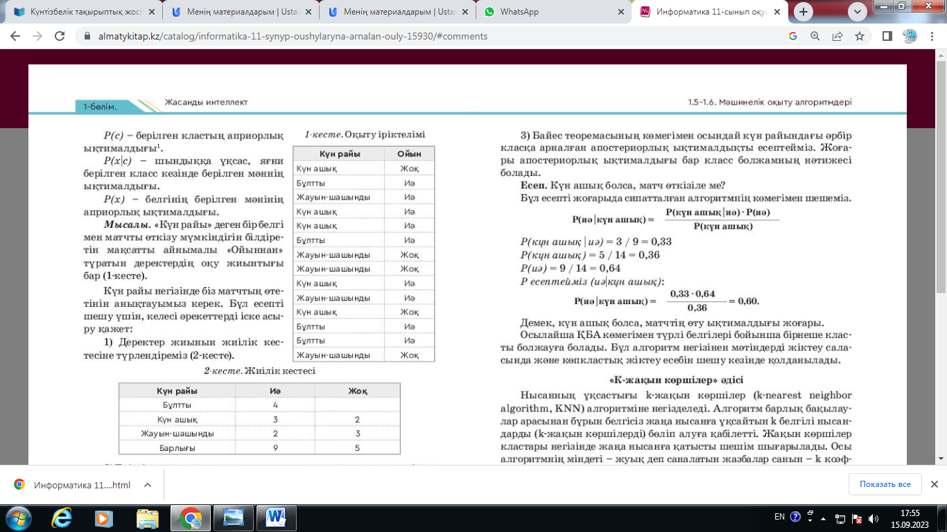Жаңа материалды мазмұндау (сыныппен жұмыс): мұғалім сабақ презентациясына және №1 материалдар файлына сүйене отырып, оқушыларды ақпаратпен таныстырады. № 1 материал Мәшинелік оқытудың негізінде белгілі бір оқыту алгоритмдері жатыр. Қарапайым Байес алгоритмі ҚБА