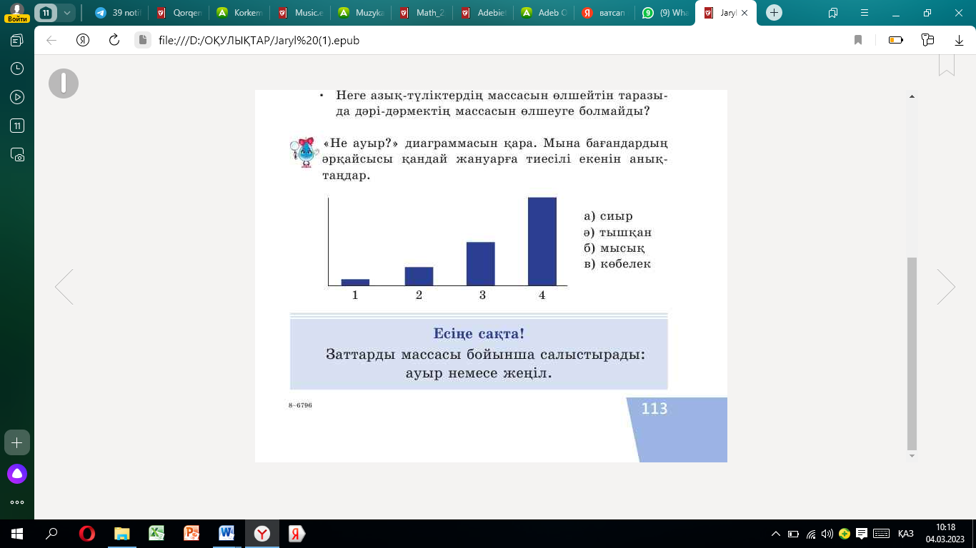 3 – тапсырма Ұжымдық жұмыс «Не ауыр?» әдісі Диаграммада берілген бағандардың әрқайсысы қандай жануарға тиесілі екенін анықта. ЕББҚ Бағандарды жануарлармен сійкестендіруде қолдау көрсету Талқылау сұрақтары: 1.Таразылардың бірі – бірінен қандай айырмашылықтары бар? 2.Заттарды қалай салыстырады? |