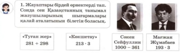 Сәйкес келетін сандарды таңдап ал.Суреттегі жазушылырдың шығармалары мен кейіпкерлерін ата.