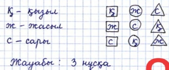 6-тапсырма. Теңдеулерді шеш. (х+ 52 345) : 201 = 345 x+52345=345*201 x+52345=69345 x=69345-52345 x=17000 (17000+52345):201=345 345=345 (у – 807) · 259 = 92 204 y-807=92204:259 y-807=356 y=356+807 y=1163 (1163-807)*259=92204 92204=92204 7-тапсырма. Тапсырманы орында. Т К Кешкі-?б Ш:1) 350*3=1050 (күндізгі сеансқа) 2) 4000-(1050+350)=2600 (кешкі сеанс) Ж: Кешкі сеансқа 2600 билет сатылды. 8-тапсырма. Егер фигураларды үш түрлі түспен бояйтын болсақ, қанша нұсқа алуға болады? Түстер қайталанбайды. .