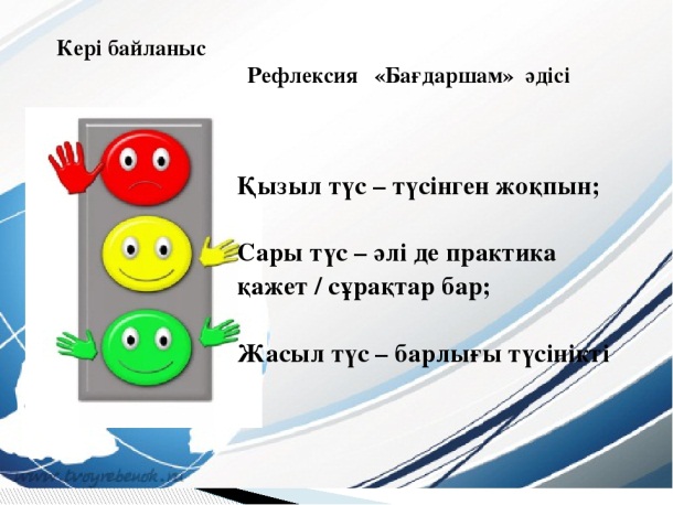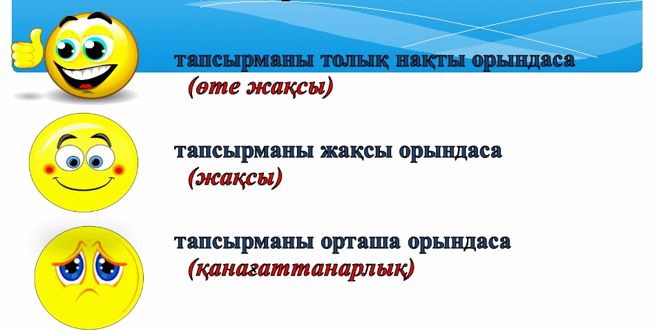 «Смайлик» арқылы бағалау. Себебі ұжымдық жұмыста, жеке жұмыста, топтық жұмыста, өзіндік жұмыста оқушылардың деңгейіне қарай бағаланады. Толық орындаған балаға-өте жақсы Жақсы орындаған балаға-жақсы Орташа орындаған балаға-қанағаттанарлық деп смайлик арқылы бағаланады.