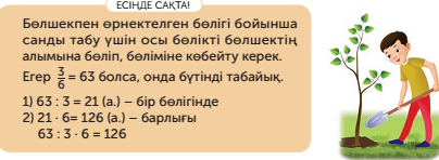 Психологиялық ахуал. Күн жарығын алақанға саламын Жүрегіме басып ұстай қаламын Ізгі, әрі нәзік, жарық мейірімді Болып кетер сонда менің жан-жағым! «АДАЛ АЗАМАТ» біртұтас тәрбие бағдарламасындағы құндылықтарды оқу процесіне ұйымдастыру кезіңінен бастап, сабақтың әрбір кезеңінде жүргіземін Ай құндылығы: жасампаздық және жаңашылдық Апталық дәйек сөз: «Жаңашылдық – заман талабы» Құндылық: Өзінің және өзгенің іс-әрекеттерін адамгершілік нормаларына сәйкестігі тұрғысынан талдай білу Үй тапсырмасын сұрау 10-тапсырма. Есептерді шығар. А Отырғызылды-2/9б-не Отырғызу керек-?км Ш: 1) 126*2/9=126:9*2=14*2=28 км (отырғызылды) 2) 126-28=98 км (отырғызу керек) Ж: Тағы жол шетінің 98км-іне ағаш отырғызу керек. Ә b=?км, 3/5б S=?км2 Р=?км Ш: 1) 15*3/5=15Ж5*3=3*3=9км (в) 2) S=a*b=15*9=135км2 3) Р=2*(а+в)=2*(15+9)=2*24=48км Ж: Егістіктің ені-9км, ауданы-135км2, периметрі-48км 1-тапсырма Ұжымдық жұмыс «Миға шабуыл» әдісі ОДД:білу,түсіну,қолдану Нұсқау: Есептерді шығар. Б Қ Ш: 21*6=126 ағаш Ж: Саяжолда 126 ағаш бар. Ә Қайың -63, бұл 3/6б Ш: 1) 63:3=21 a (бір бөлігінде) 2) 21*6=126a (барлығы) Ж: Саяжолда 126 ағаш бар.